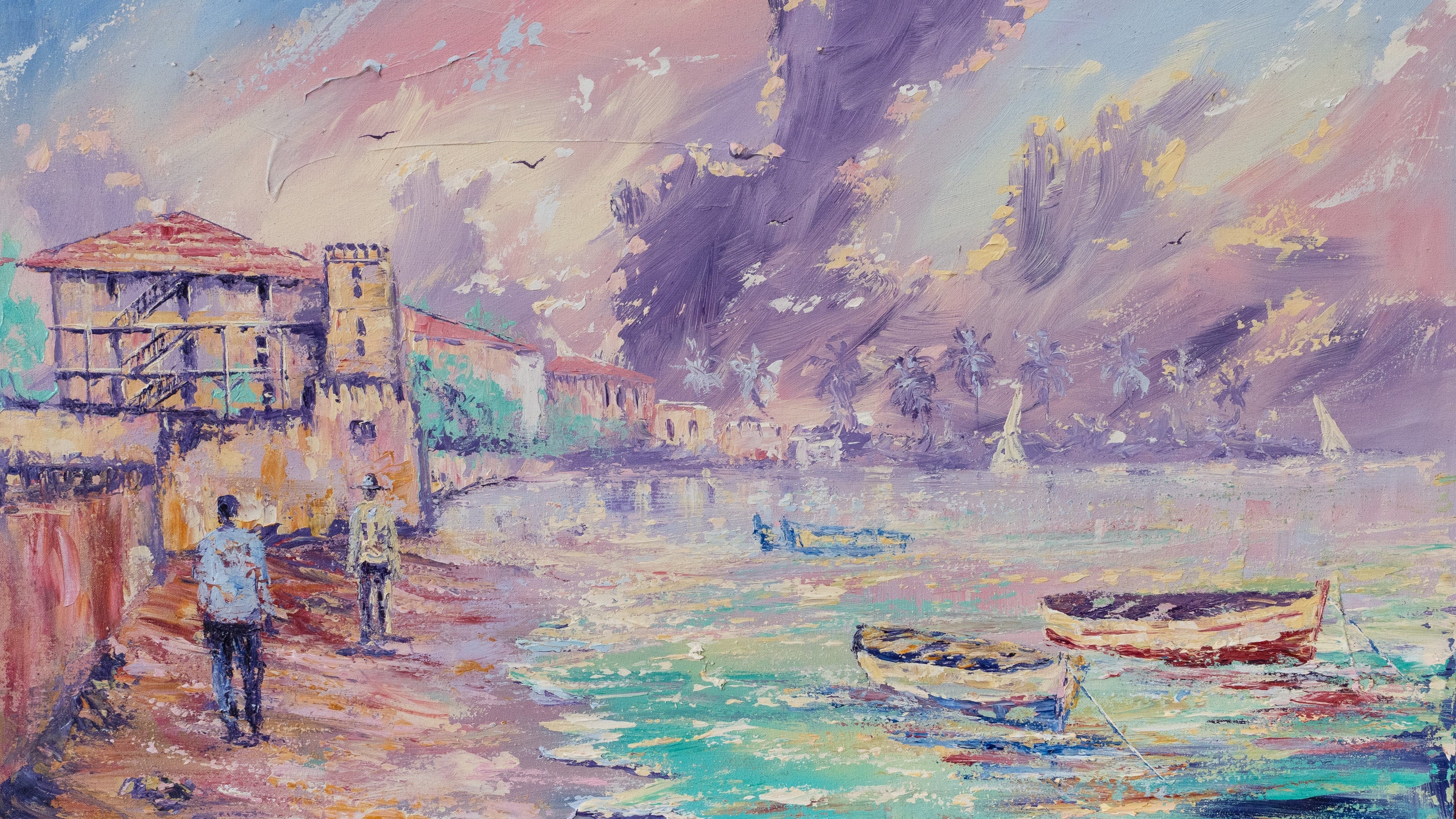 Mit warmen Farbtönen wie Orange, Rosa und Violett schafft Dullah romantische und fesselnde Bilder der Insel im Indischen Ozean. Seine Bilder vermitteln oft ein Gefühl der Ruhe und zeigen den einzigartigen Charme Sansibars.