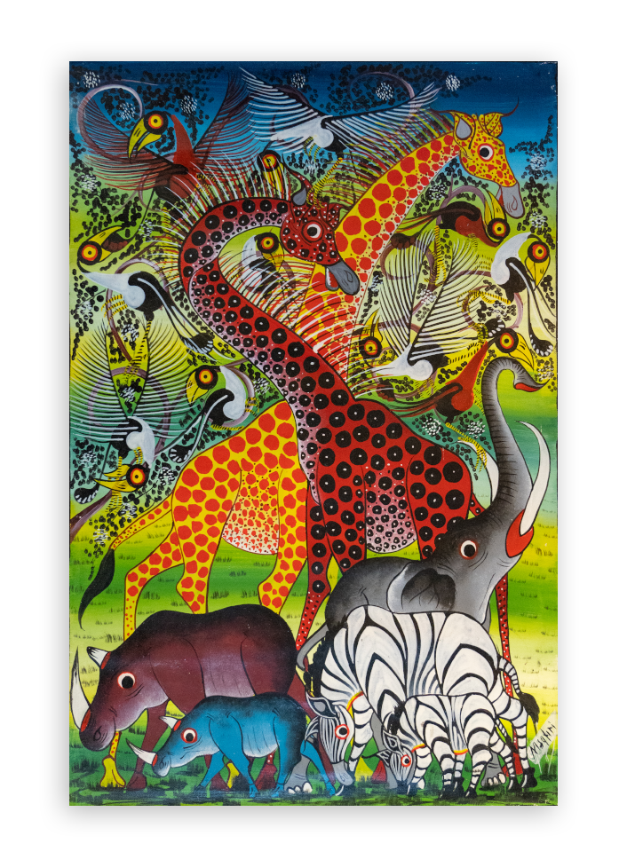 Msafiri R. Mrisho ist ein talentierter tansanischer Künstler aus dem künstlerischen Hotspot Bagamoyo. Seine Gemälde zeigen oft die reiche und vielfältige Tierwelt Tansanias. Mit verschiedenen Techniken erweckt er diese Tiere auf Leinwand zum Leben, von realistischen Darstellungen bis zum lebendigen und farbenfrohen Tinga Tinga-Stil…