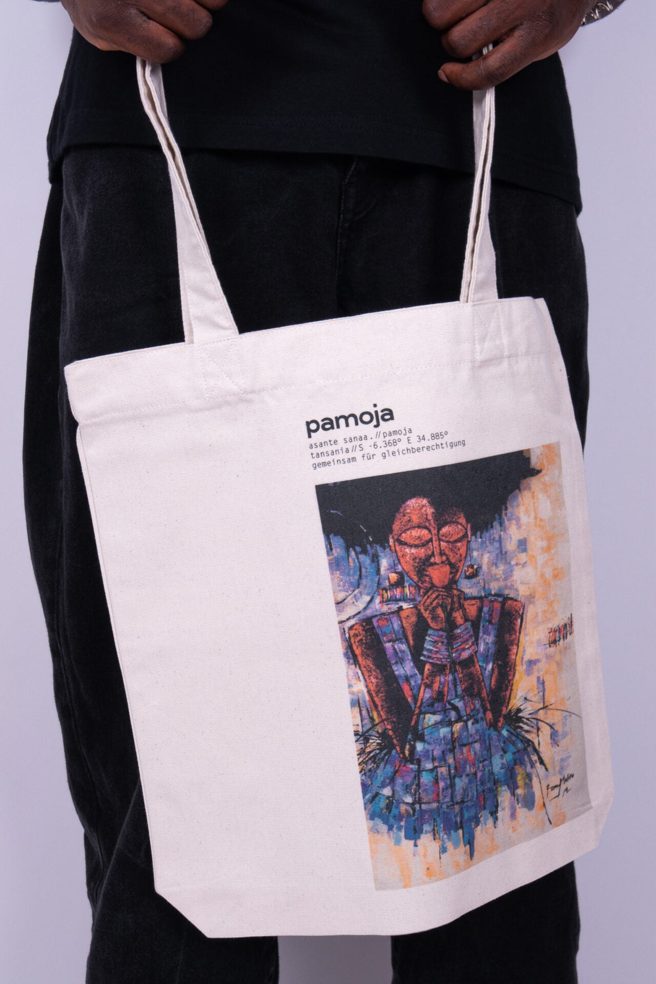 Mit dem Stoffbeutel, basierend auf dem Gemälde von Boniface Kastor Mwiru, hast du immer einen besonderen Begleiter im Alltag dabei, wo auch immer dich dein Weg gerade hinführt.
