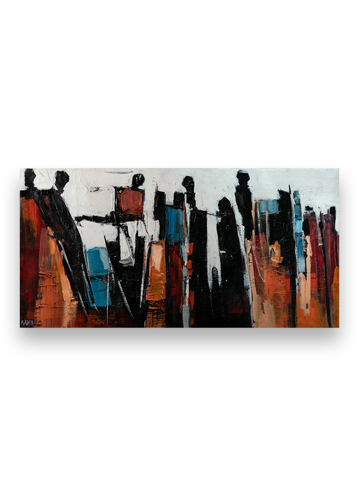 Das Gemälde “Meeting” von Salum Kambi zeigt eine abstrakte Versammlung dunkler, silhouettenhafter Figuren vor hellem Hintergrund. Die Gestalten wirken schemenhaft und aufstrebend, als ob sie in einem Dialog oder einer kollektiven Bewegung vereint wären. Mit kräftigen Kontrasten aus Schwarz, Weiß, Rot und Blau erzeugt Kambi eine vibrierende Spannung zwischen Nähe und Distanz. Die Struktur der Farbflächen verleiht Dynamik und Tiefe, wodurch das Werk zugleich von Gemeinschaft, Austausch und urbanem Rhythmus erzählt.