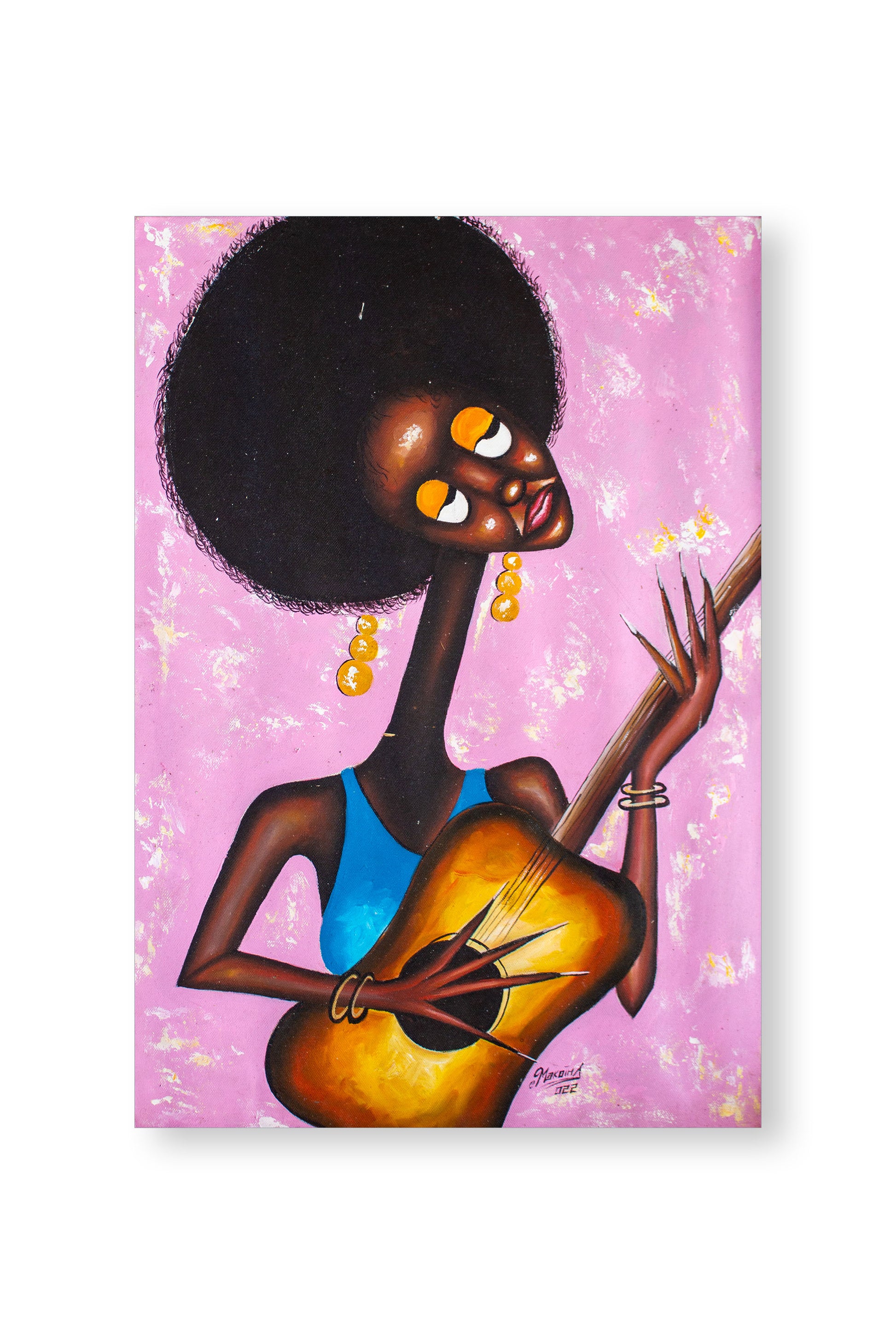 Mit “Music” hat Ayoub Makhota ein Kunstwerk erschaffen, das die universelle Sprache der Musik feiert und gleichzeitig die kulturelle Vielfalt Afrikas hervorhebt. In dieser karikaturhaften Darstellung wird nicht nur die Freude am Musizieren, sondern auch die kulturelle Verbundenheit der Frau mit ihrer Musik deutlich.